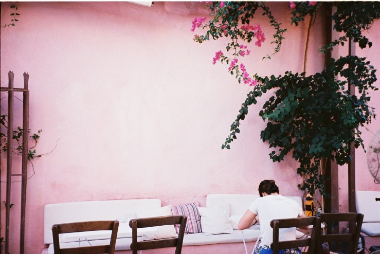 3. The sun sets late here, giving so much room for light. For day to outlast night; for time to transcend into just a yellow hue across the atmosphere. At 8:30PM, the sun starts its descent. I sit on the balcony with our AirBnB host, Evan. We talk about where we’ve been and where we’re going. His home is ideal. It is small enough for every corner to be filled and for one to live in solitude, but big enough to move around, and I imagine, to dance freely through with a few people you love. There is poetry on the bookshelf. But there is poetry everywhere. There is a balcony that goes all the way around the apartment, lined with plants thriving in the humidity. And from the balcony, through the bamboo slits, I see: Athens. The uneven tallness of apartments. And directly in front of me: an abandoned space, or in the process of abandonment, nestled between two apartment buildings. The space becomes a window for what’s behind. Clear in view, a green apartment building. The kind of green that is easy on the eyes, that invites you in. On the balcony of that building, directly eye-level from me sits an old couple. One chair each, but a shared love.